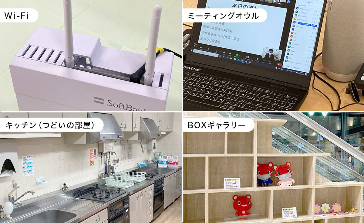 ①BOXギャラリー ②パーテーション ③Wi-Fi ④ミーティングオウル ⑤スタジオシステム ⑥プロジェクター ⑦キッチン(つどいの部屋) ⑧ミニキッチン(移動式) ⑨メールBOX ⑩総合掲示板